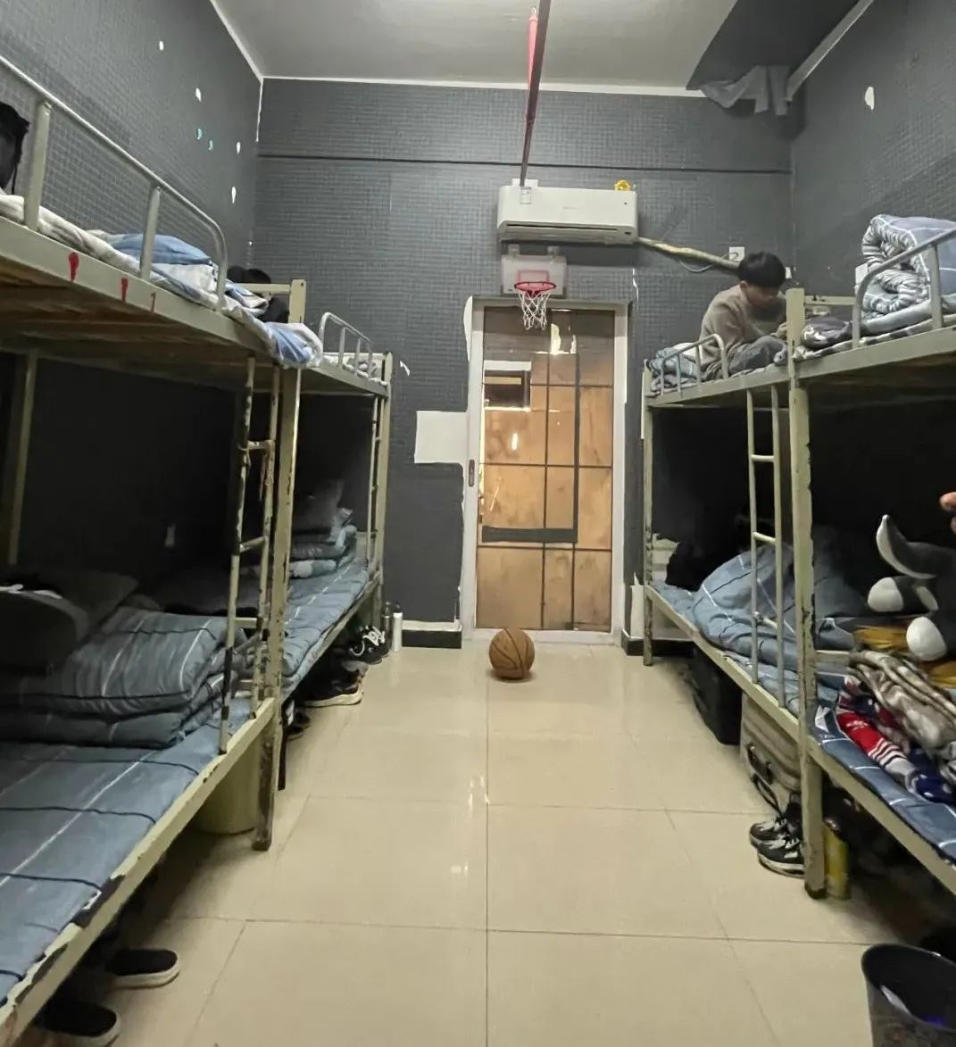 落日歸山海,籃球陪少年。整個(gè)宿舍用簡(jiǎn)潔的黑底白格墻紙包裝,在空調(diào)下方裝飾了一個(gè)他們最愛的籃球框,體現(xiàn)他們對(duì)籃球的熱愛!