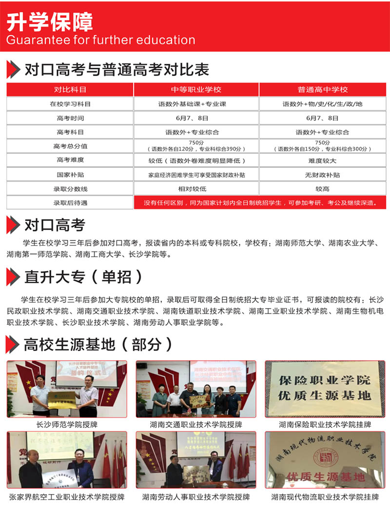 學生在校學習三年后參加大專院校的單招,錄取后可取得全日制統(tǒng)招大專畢業(yè)證書,可報讀的院校有:長沙民政職業(yè)技術學院、湖南交通職業(yè)技術學院、湖南鐵道職業(yè)技術學院、湖南工業(yè)職業(yè)技術學院、湖南生物機職業(yè)技術學院、長沙職業(yè)技術學院、湖南勞動人事職業(yè)學院等。